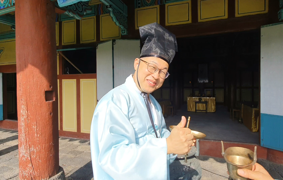 6月24日,首坛千字文麦酒由洪川启程,乘飞机运抵济州岛。这是它走出的第一步,不是进入市场,而是走入文化之地——济州乡校。济州乡校自朝鲜时代以来,便是济州儒林教化之所,至今仍保留着完整的祭孔制度与文化传统。当天午后,乡校内便开始了焚香告由前的周密筹备:儒林们恭敬地整理祭礼物品,并手写告由文,为次日仪式营造出庄重而沉静的氛围。这不仅是一场仪式的准备,更是一种对传统礼制的回归。